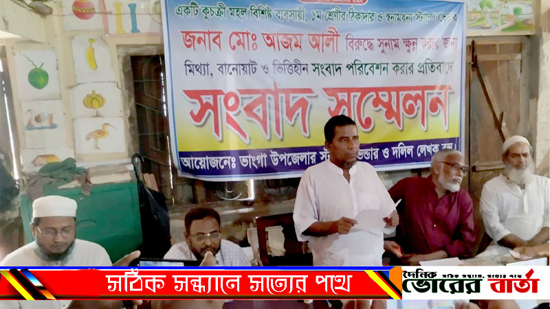 ফরিদপুরের ভাঙ্গার স্ট্যাম্প ভেন্ডার আজম আলীর বিরুদ্ধে দুটি স্থানীয় দৈনিক পত্রিকায় হয়রানি মূলক সংবাদ ও অপপ্রচারের বিরুদ্ধে সংবাদ সন্মেলন করেছেন ভাঙ্গা উপজেলা স্ট্যাম্প ভেন্ডার ও দলিল লেখক সমিতি।