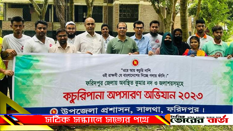 ওরে আয় কচুরি নাশি ঐ রাক্ষসী যে বাংলাদেশের দিচ্ছে গলায় ফাঁসি এই প্রতিপাদ্য বিষয়কে সামনে রেখে ফরিদপুরের সালথায় কচুরিপানা অপসারণ অভিযানের উদ্বোধন করা হয়েছে।