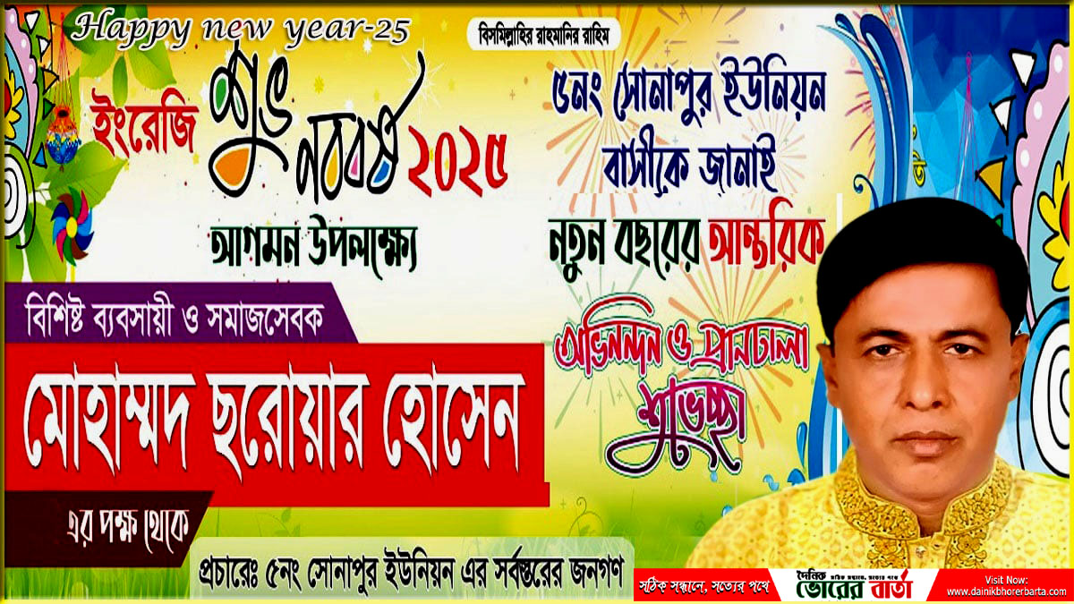 সবাইকে শুভেচ্ছা জানিয়ে লিখেন- বিশিষ্ঠ ব্যবসায়ী সমাজ সেবক মোহাম্মদ ছরোয়ার হোসেন ‘সবাইকে নতুন বছরের শুভেচ্ছা। সুন্দর একটা বছর এবং সুন্দর হোক প্রতিটি দিন প্রতিটি মুহূর্ত। হ্যাপি নিউ ইয়ার ২০২৫।’