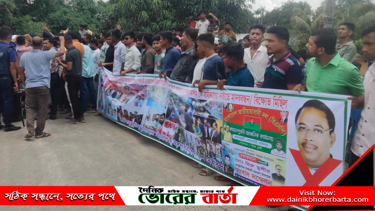 জুনু গ্রুপের একদল ক্ষুব্ধ বিএনপি কর্মী হাতে ব্যানার নিয়ে অবস্থান নেয়। দাবি একটাই—খন্দকার নাসিরুল ইসলামকে অবিলম্বে বহিষ্কার করতে হবে।